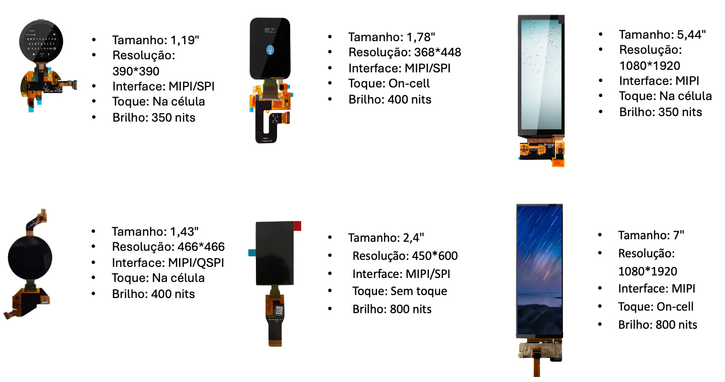 A tecnologia AMOLED apresenta vantagens como alta resolução, baixo consumo de energia e baixas temperaturas de operação (-40°C). É utilizada principalmente em dispositivos médicos, wearables e mesas industriais.