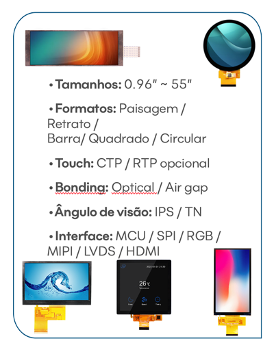 | Tamanho | Resolução | Brilho | Interface | Ângulo de visão | Touch | Remark |
