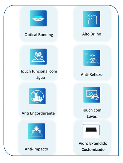 | 12.3″ | 1920*720 | 700 | LVDS | IPS | CTP | Compatível com Toradex |